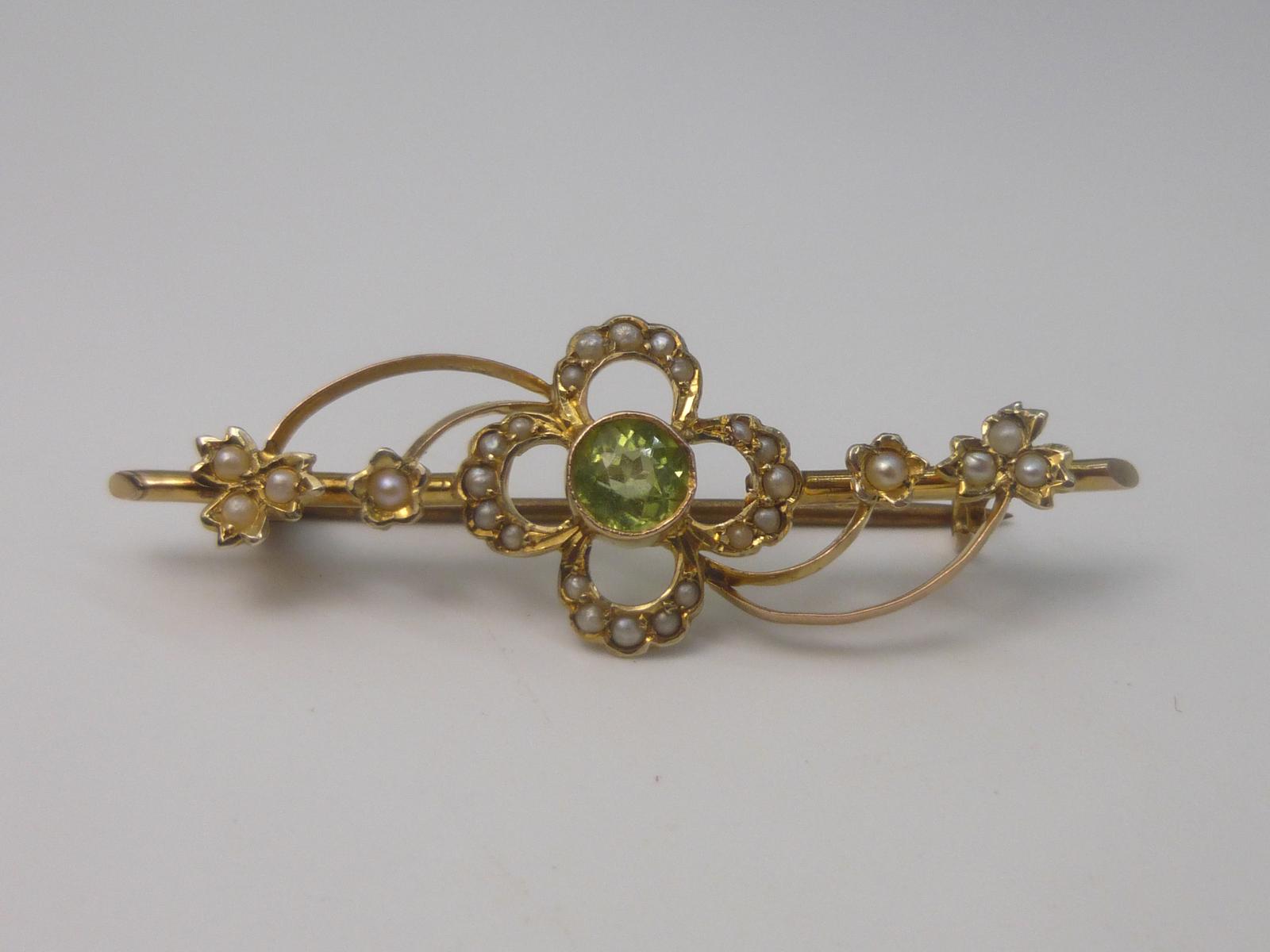 Edwardian 9ct Gold Peridot & Seed Pearl Brooch