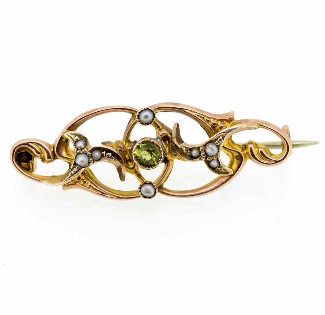 Edwardian 9ct Rose Gold Peridot & Pearl Brooch