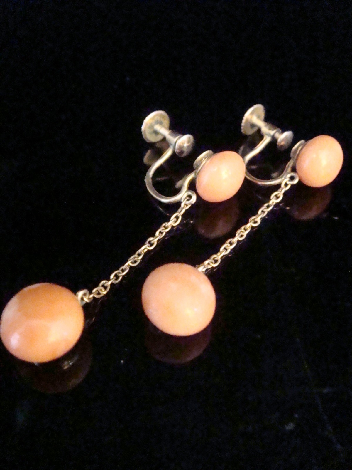 Edwardian 9ct Yellow Gold Natural Coral Drop Earrings