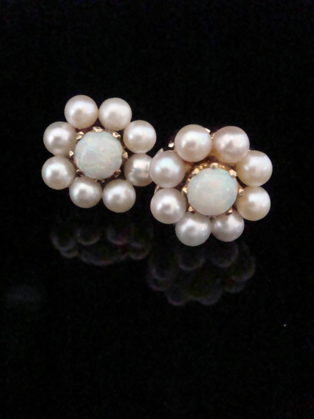 Edwardian 9ct Yellow Gold Natural Opal & Cultured Pearl Cluster Earrings