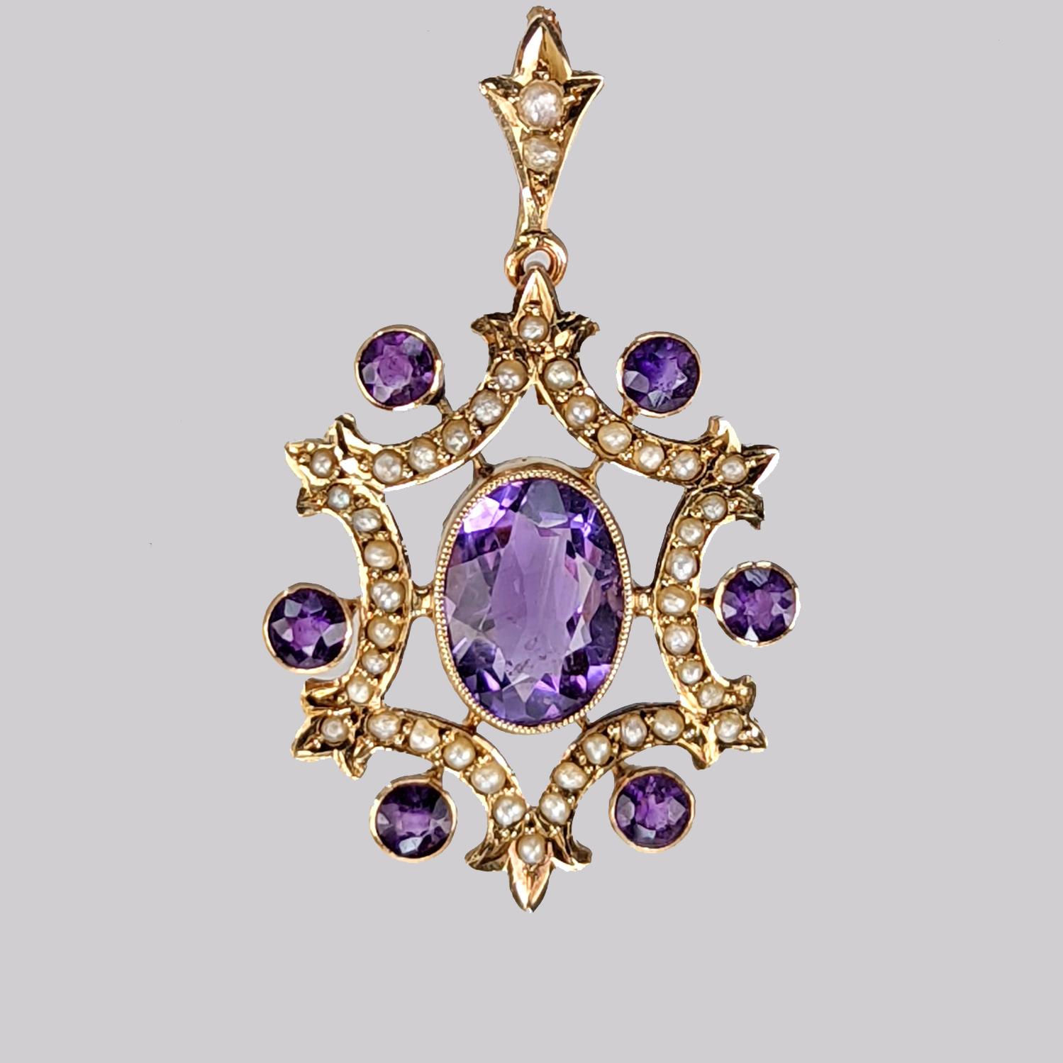 Edwardian Amethyst & Pearl Pendant Vintage 9ct Gold Antique Pendant c.1905