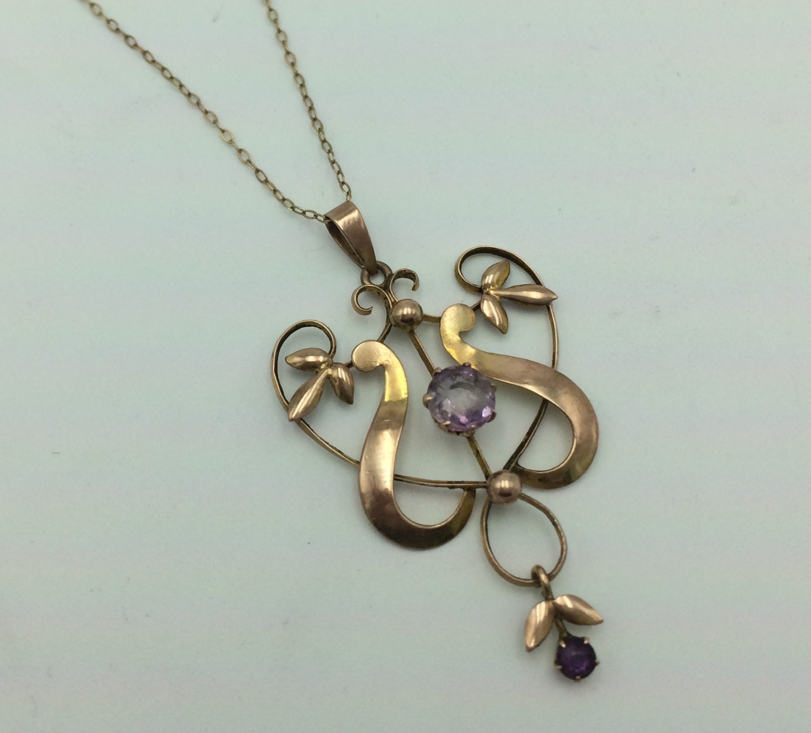 Edwardian Art Nouveau 9ct Rose Gold & Amethyst Openwork Scroll Pendant