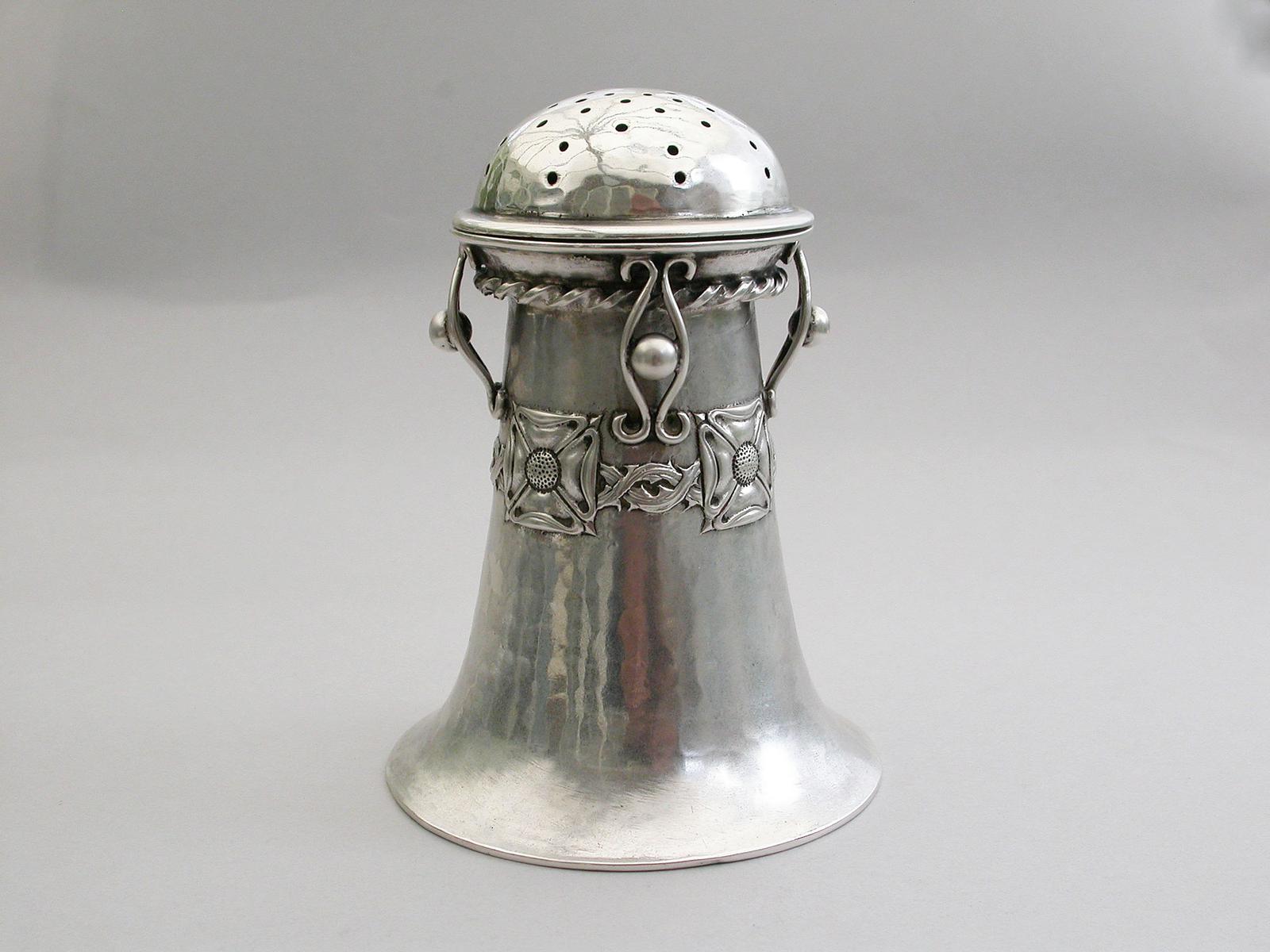 Edwardian Arts & Crafts Spot Hammered Silver Caster by Omar Ramsden & Alwyn Carr, London, 1905