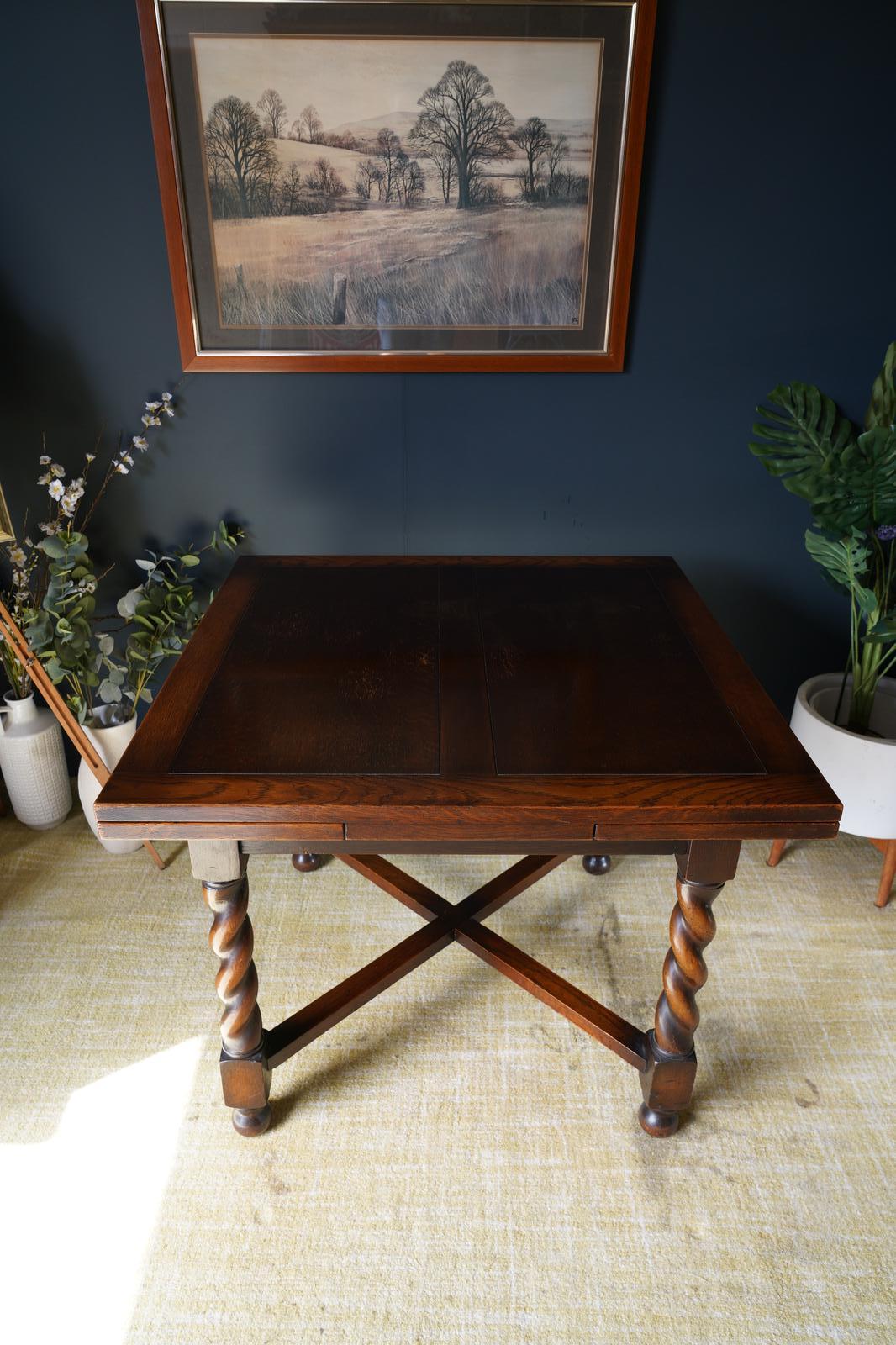 Edwardian Barley Twist Cross Beam Dark Oak Extending Table & Chairs