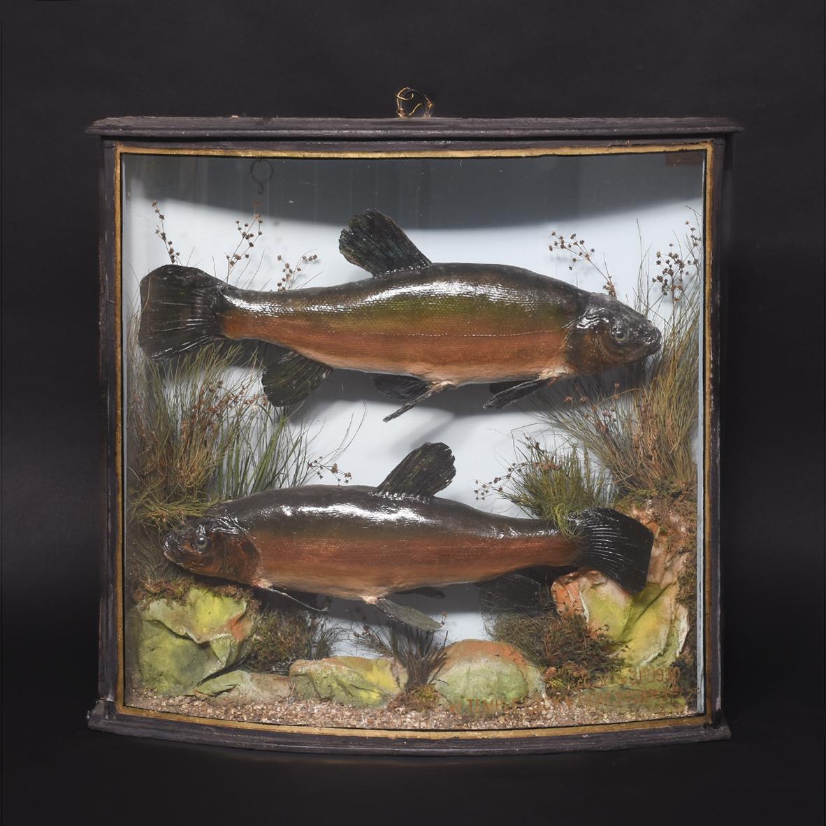 Edwardian Bowfront Glazed Case of Two Large Taxidermy Trout Within Ebonized & Gilt Decorated Frame