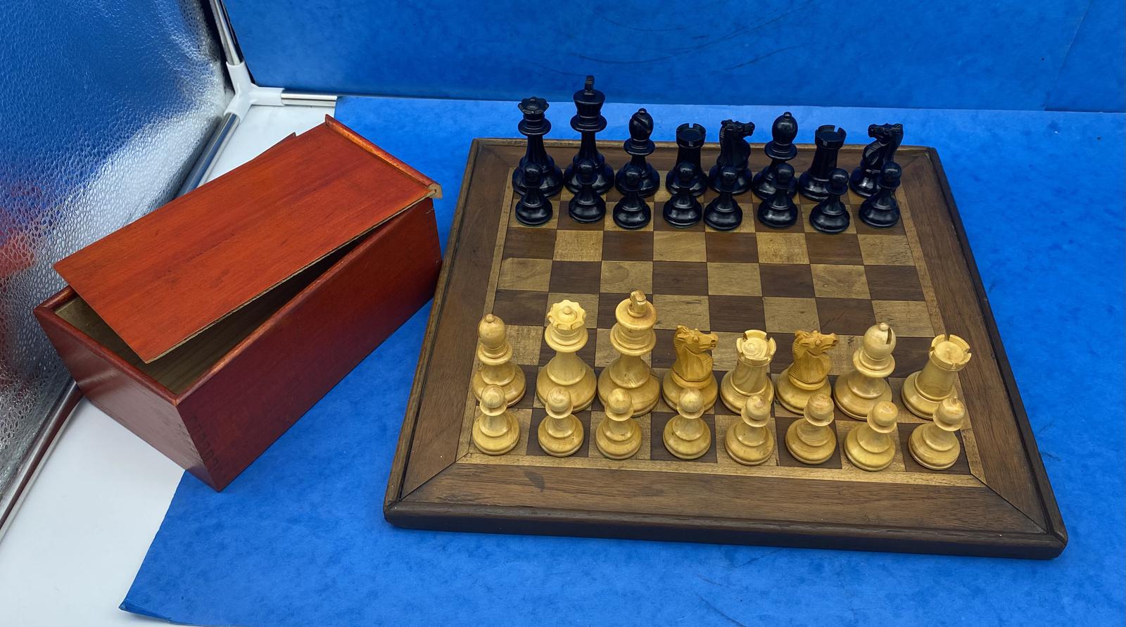 Edwardian Boxwood and Ebony Boxed Chess Set with Board