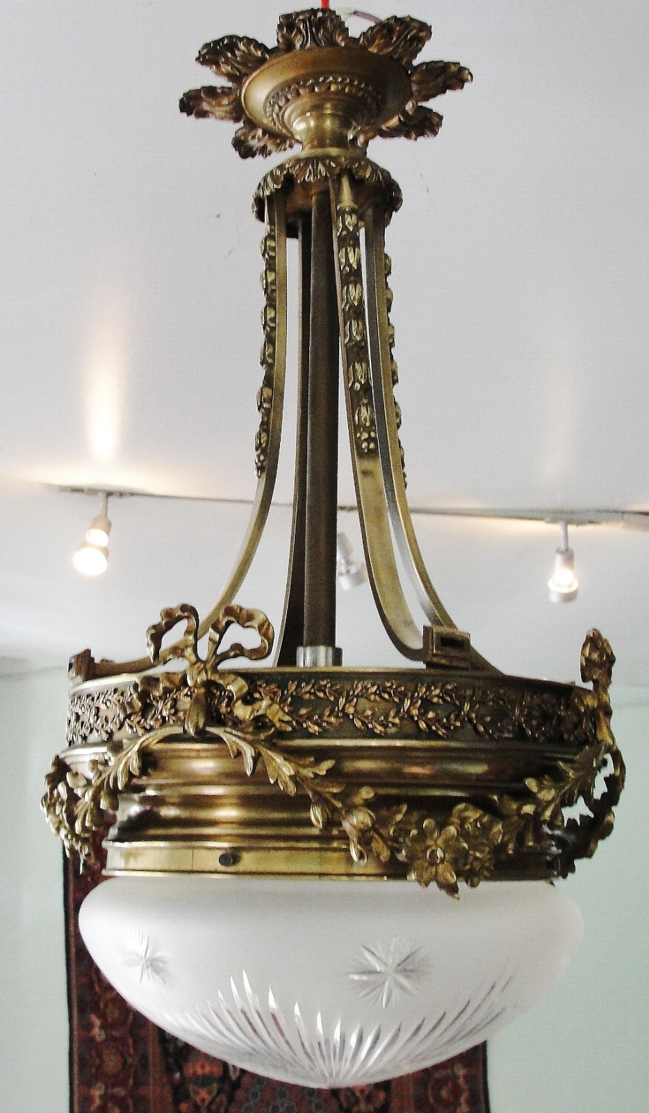 Edwardian Brass Ceiling Light with Cut Glass Bowl