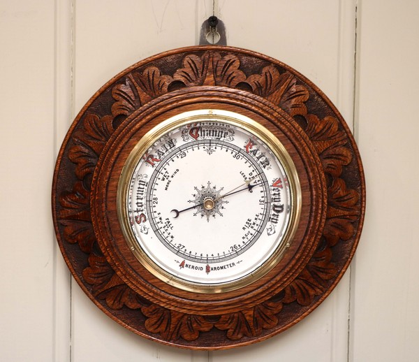 Edwardian Carved Circular Oak Barometer, English c.1910 (1 of 1)