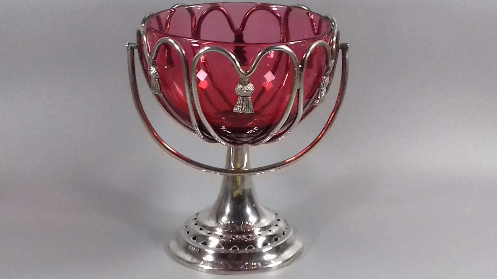 Edwardian cranberry glass silver plated sugar bowl/ bob bon dish swags