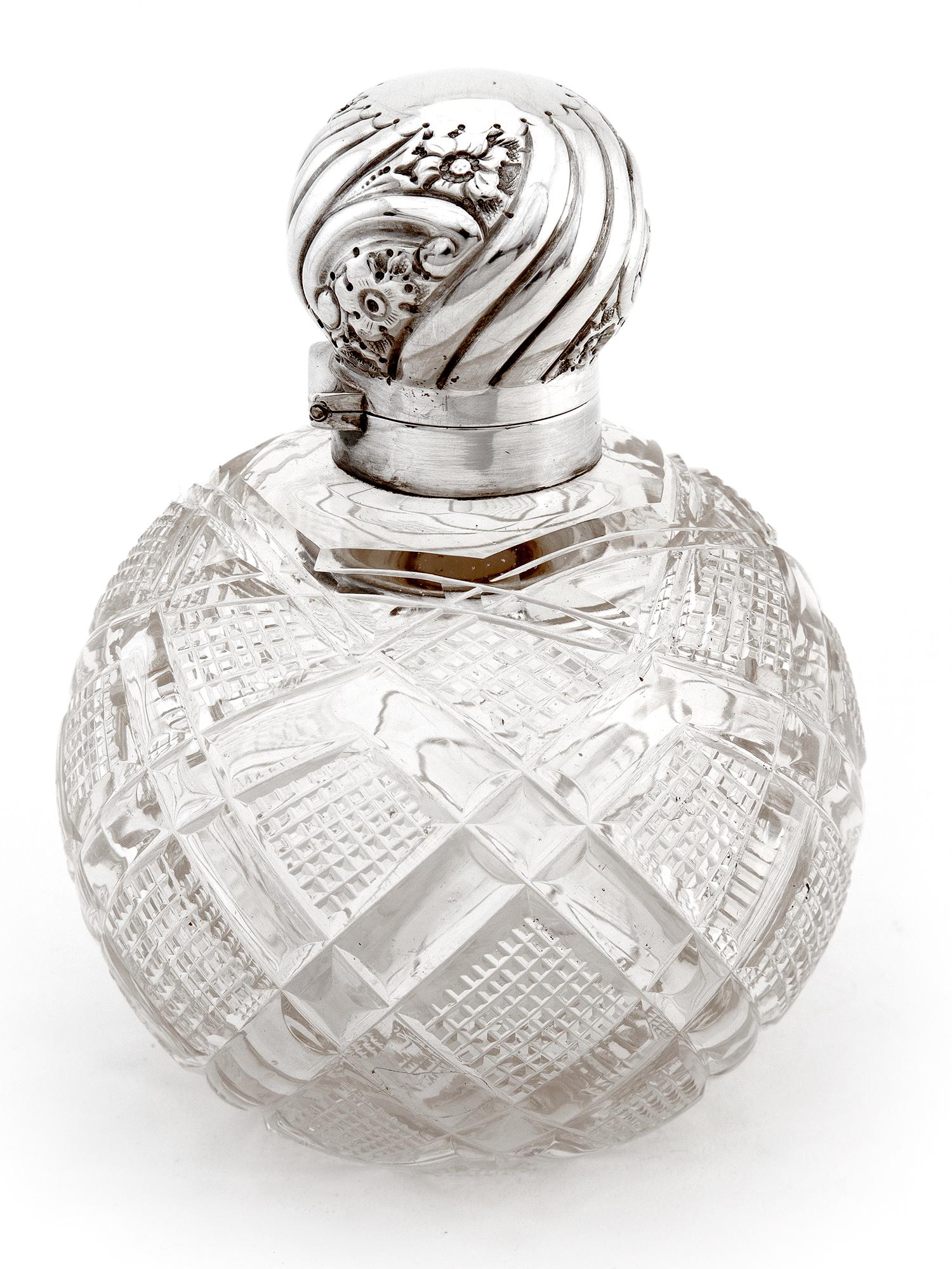 Edwardian Cut Class and Silver Spiral and Floral Lidded Perfume Bottle