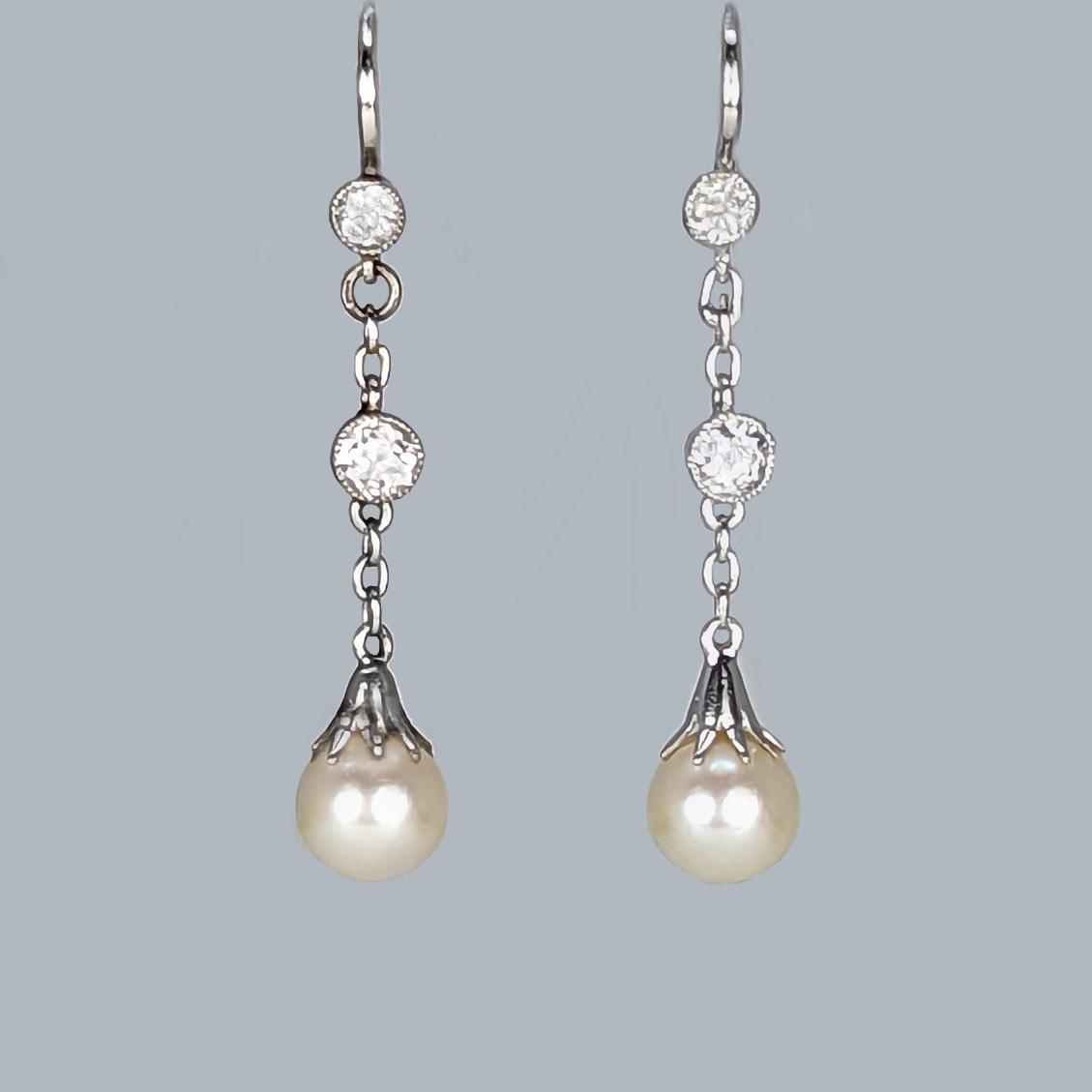 Edwardian Diamond & Pearl Drop Earrings Platinum Antique Hook Dangle Earrings