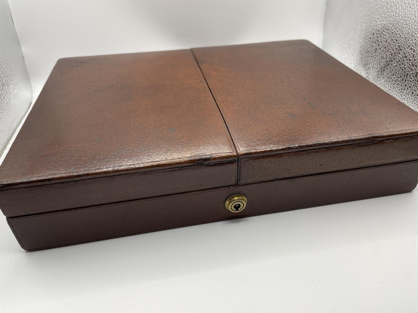 An unusual Jewellery case with twin lids and a fitted interior, some wear but still useable and displays well. Old embossed initials top left top left of lid which could be removed.