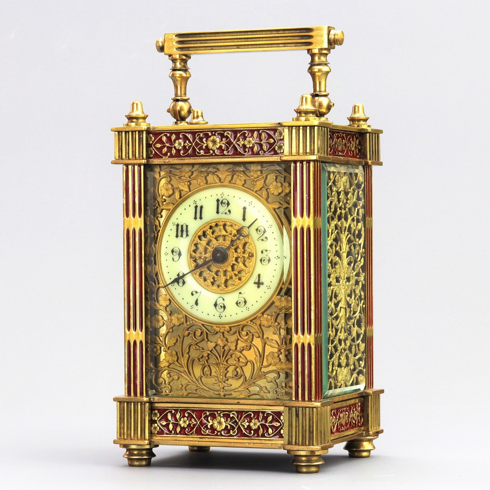 Edwardian Gilt Filigree & Enamel Brass French Carriage Clock c.1905