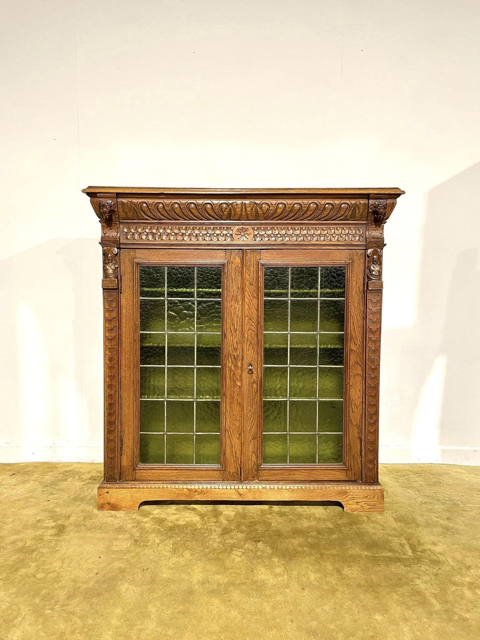 Edwardian Gothic Style Bookcase With Green Glass Leaded Doors (1 of 14)