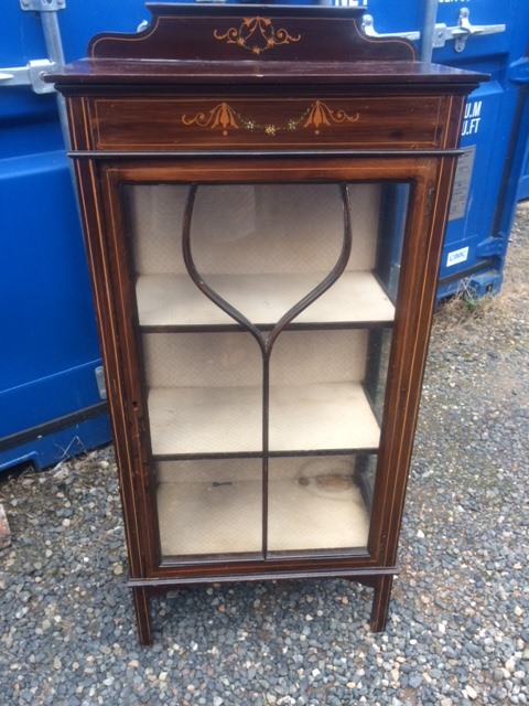 Edwardian Inlaid Mahogany China Cabinet Vitrine with 3 Shelves, Door & Key