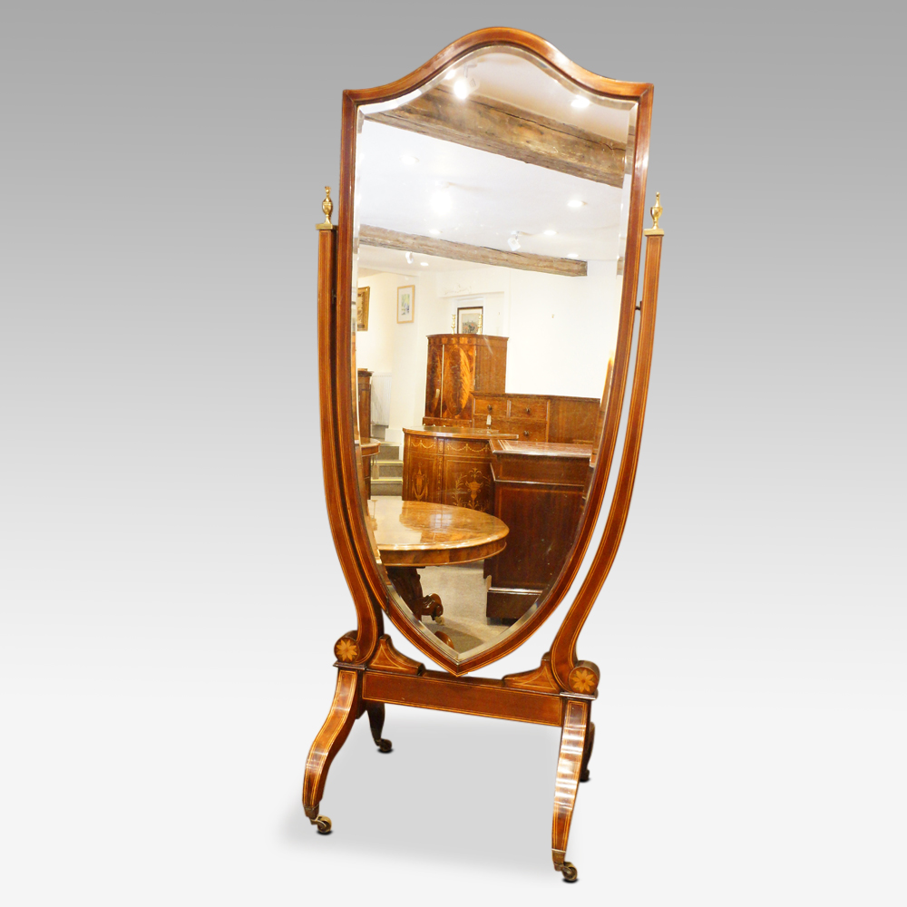 Edwardian Inlaid Mahogany Shield Shape Cheval Mirror