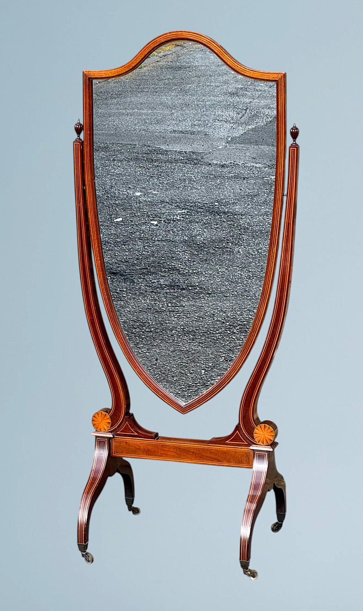 Edwardian Inlaid Mahogany Shield Shape Cheval Mirror