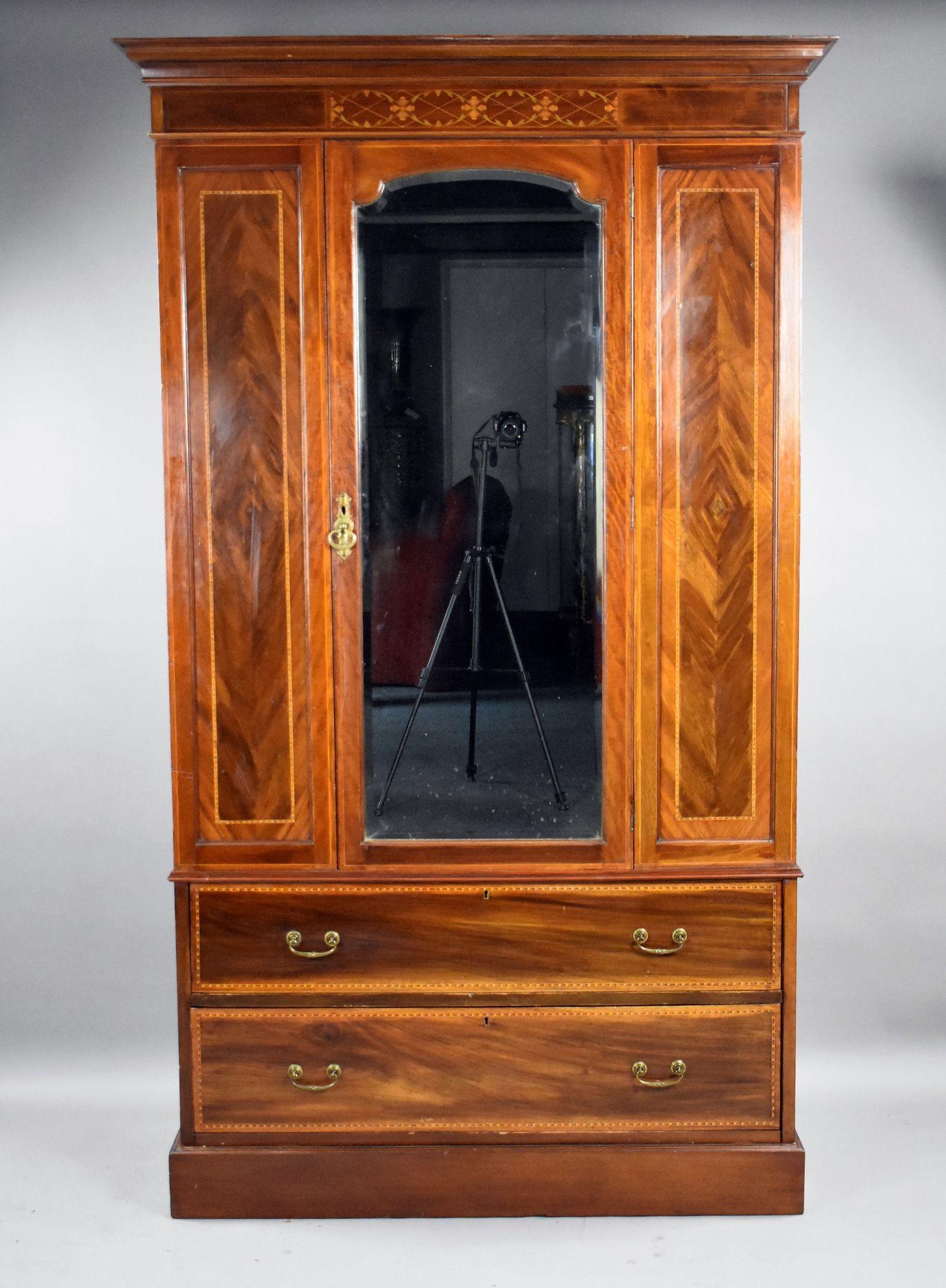 An elegant Edwardian inlaid mahogany single wardrobe of pleasing proportions, displaying well-figured veneers throughout. The wardrobe is surmounted by a moulded cornice incorporating a finely inlaid frieze, positioned above a central mirrored door flanked by beautifully bookmatched mahogany panels with delicate inlaid stringing.