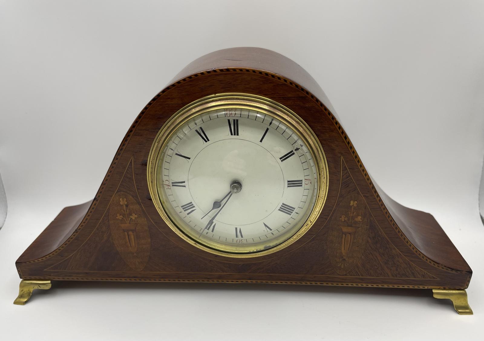 An Edwardian Mahogany cased mantel or shelf clock with nice inlay decoration. French 8 day movement running well and keeping reasonable time but untouched by us so carries no guarantee other than those offered regards "Distance Selling Regulations".
