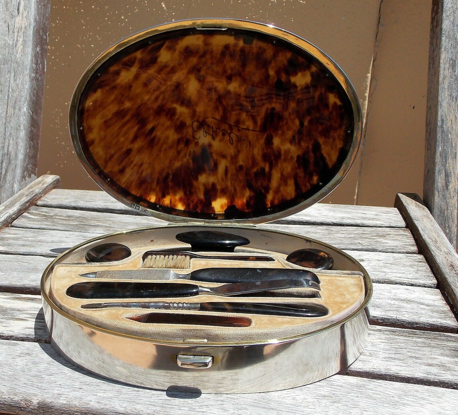 Edwardian J Bateman & Son Solid Silver & Faux Tortoiseshell Oval Complete Manicure Box London 1911