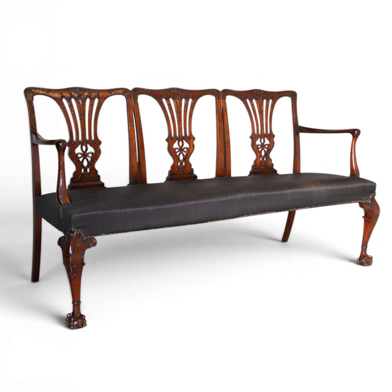 This settee dates to the Edwardian era, a period that revived and celebrated earlier English design traditions. The Chippendale‑style back - with its pierced, interlaced splats and flowing curves - is a hallmark of this revival, executed here with exceptional crispness and clarity.