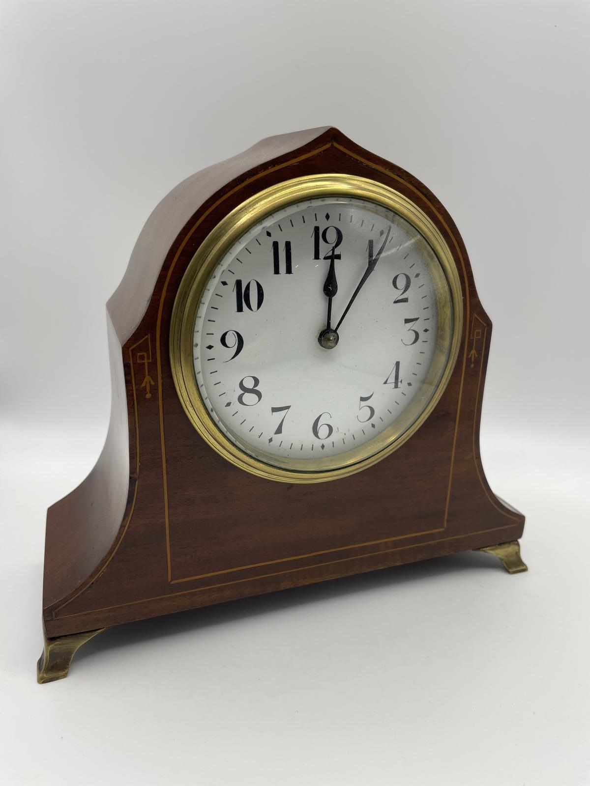 An Edwardian mantel clock with inlaid Mahogany case, French 8 day movement running well and keeping reasonable time but untouched by us so carries no guarantee other than those offered regards "Distance Selling Regulations".