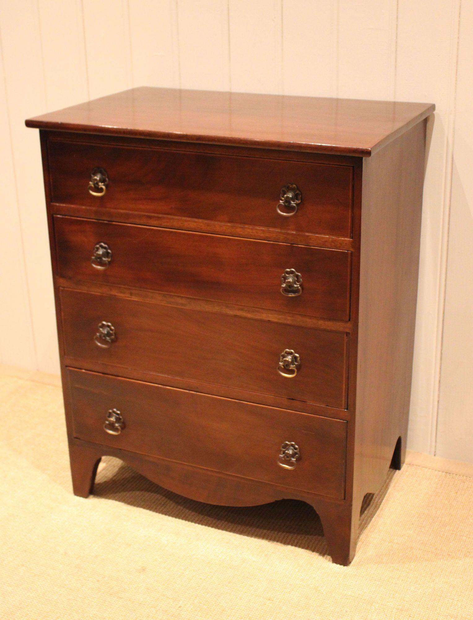 Small proportioned mahogany chest of four long graduated drawers , raised on bracket feet . The drawer depths from the bottom up are 13.5 cm , 12.5 cm , 10 cm and at the top 9 cm deep .