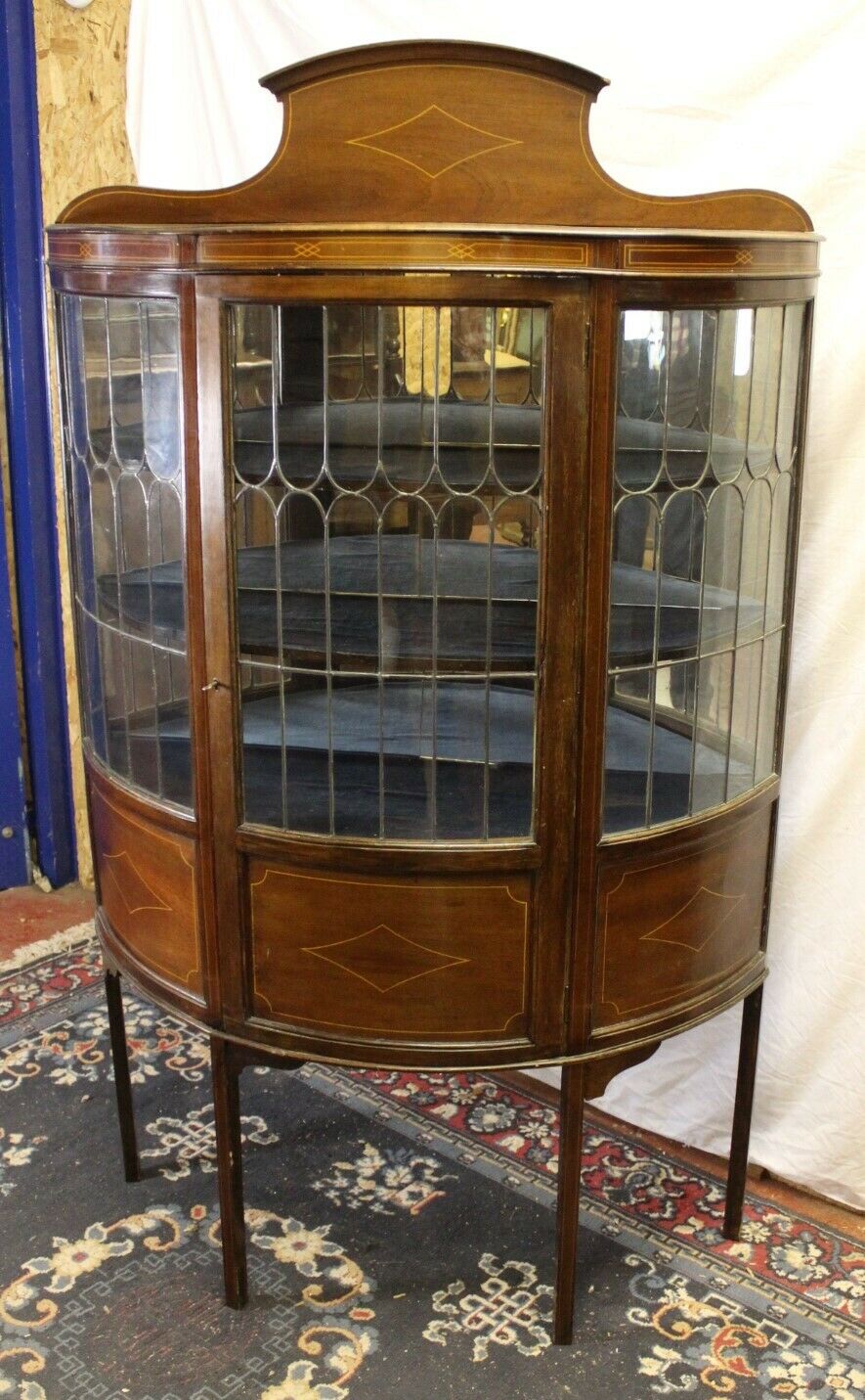 Edwardian Mahogany China Half Moon Cabinet with Inlay & Lead Glass Door