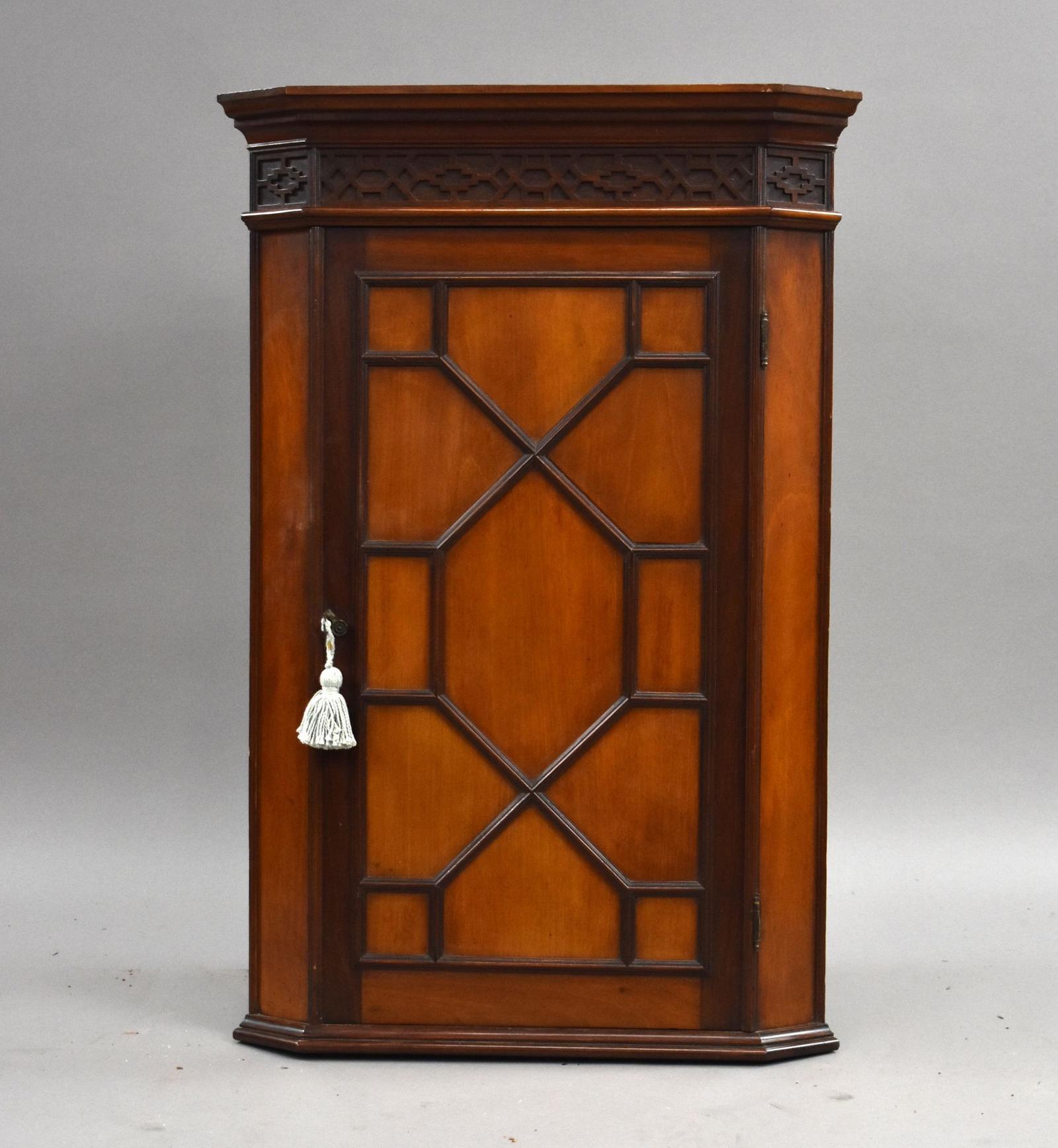 The upper section is finished with a decorative pierced fretwork frieze, adding a touch of craftsmanship and visual interest. The cabinet is designed to sit neatly into a corner, making it ideal for smaller rooms, hallways, or alcoves.