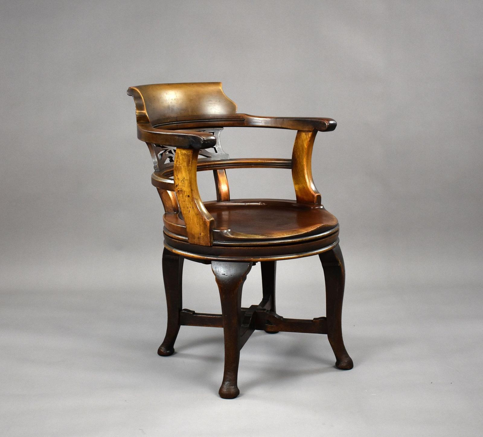 A well-proportioned Edwardian mahogany desk chair of solid and practical form, featuring a shaped horseshoe back with gently scrolled terminals and a pierced splat, providing both comfort and visual interest. The curved arms flow smoothly into the supports, enclosing a shaped solid seat with a moulded edge. The chair stands on sturdy cabriole legs united by a shaped X-form stretcher, giving excellent stability and presence. Retaining a warm, mellow patina with surface wear consistent with age and use, this is a characterful and functional chair, ideal for use at a desk or as an occasional chair in a study or library.