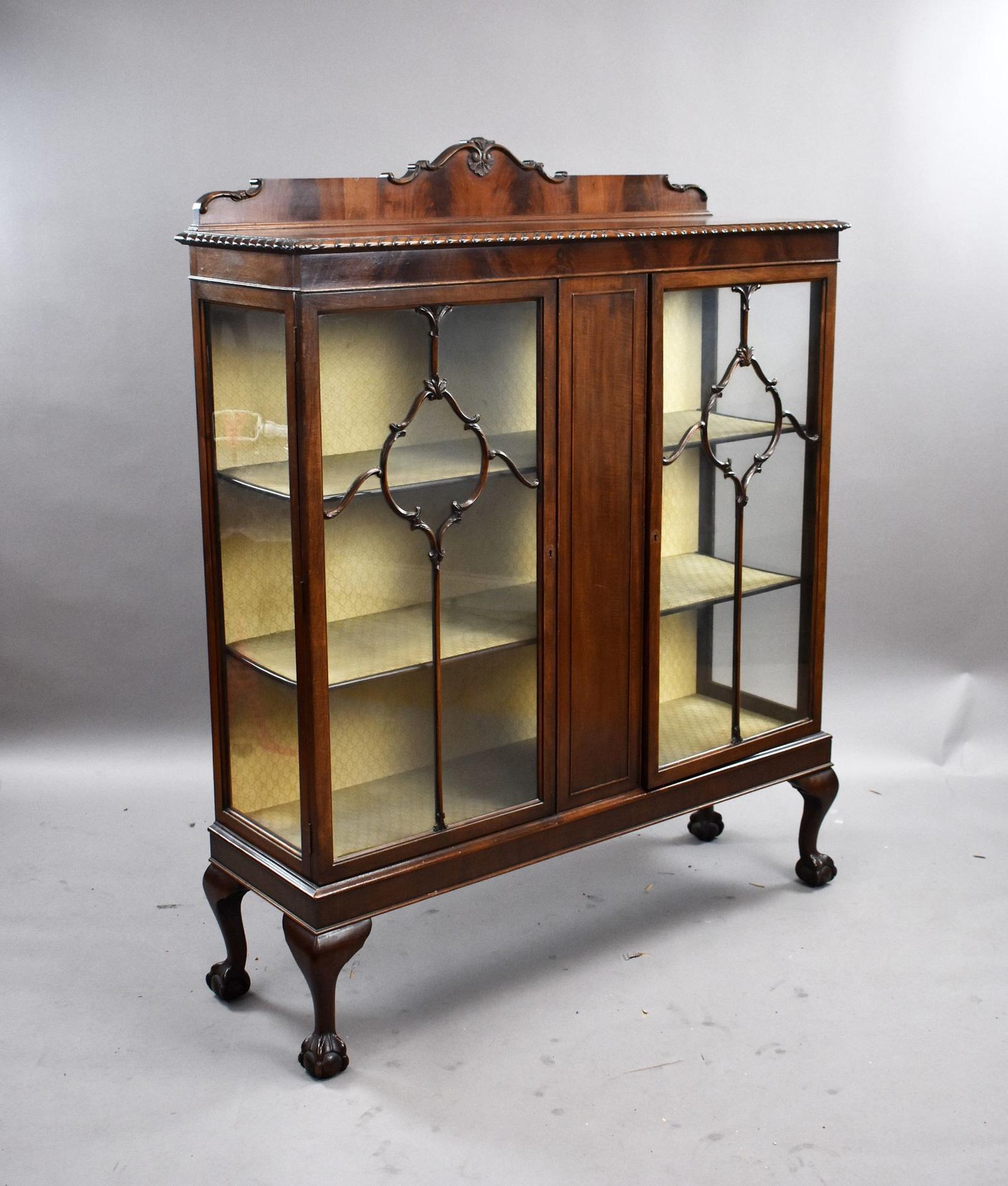 A refined Edwardian mahogany display cabinet of elegant proportions, raised on shapely cabriole legs terminating in pad feet. The cabinet features a beautifully shaped and carved gallery back above a moulded cornice, with the whole showcasing well-figured mahogany veneers throughout. The twin glazed doors are adorned with decorative astragal mouldings, opening to reveal a fully shelved interior lined in a soft fabric, ideal for displaying porcelain, glassware, or decorative objects. A central panelled section provides a pleasing symmetry to the overall design.