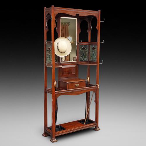 Edwardian Mahogany Hat & Coat Hall Stand of Art Nouveau Design - with original stained glass inset panels and coat hooks all of Art Nouveau form, replacement drip trays - Matthews of Gloucester (f.1876)