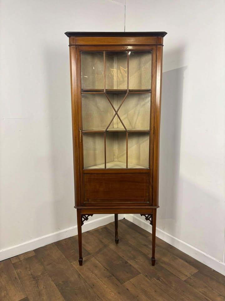 A refined Edwardian corner display cabinet crafted in richly figured inlaid mahogany, offering elegant proportions and delicate detailing throughout. Designed to sit neatly into a corner, this piece combines decorative presence with practical display storage, making it ideal for china, books, or collectables.