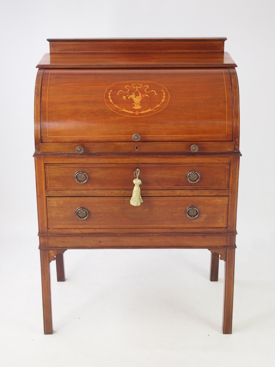 Edwardian Mahogany & Inlaid Cylinder Top Bureau