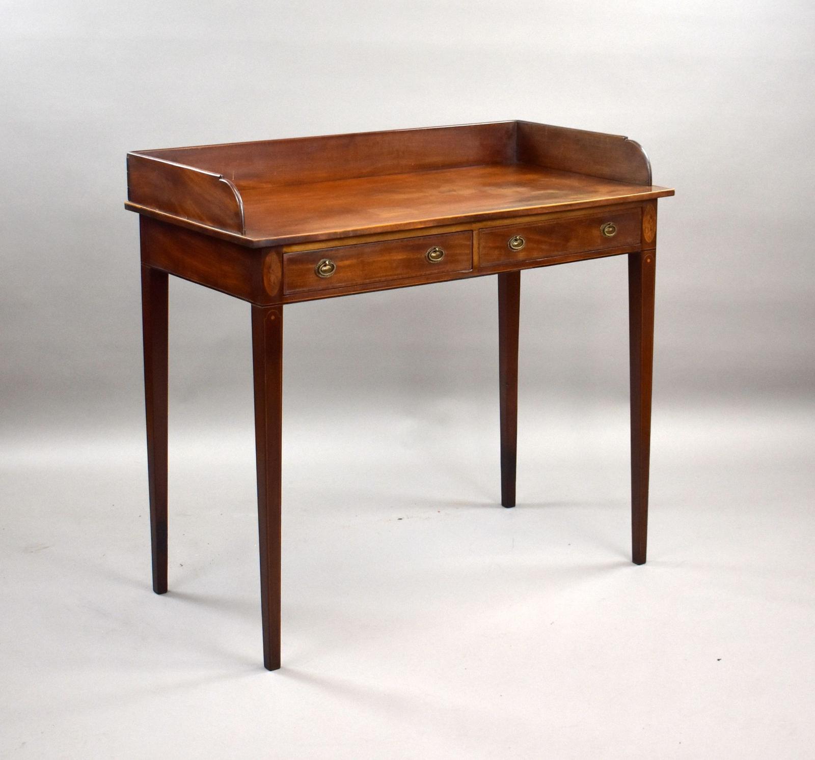 The frieze is fitted with two drawers, each retaining its original brass oval handles, and subtly enriched with fine inlaid detail. The legs are square and tapering, decorated with delicate line inlay, and united by the simplicity and balance characteristic of Edwardian design.