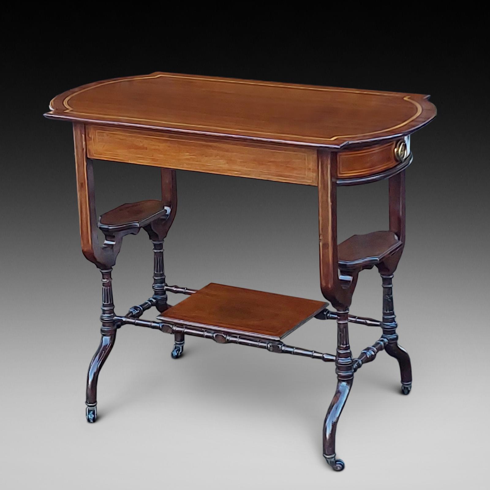 Edwardian Mahogany Inlaid Two Drawer End Table - with undertier shelf, platform stretcher and porcelain castors, - 33"w x 17.5"d x 27"h