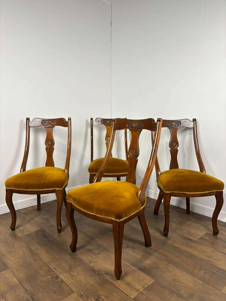 The seats are upholstered in a rich dark gold velvet-style fabric, finished with attractive braided trim around the edges, offering both comfort and visual warmth. The mahogany frames have a pleasing tone and patina, with gently curved legs completing the refined look.
