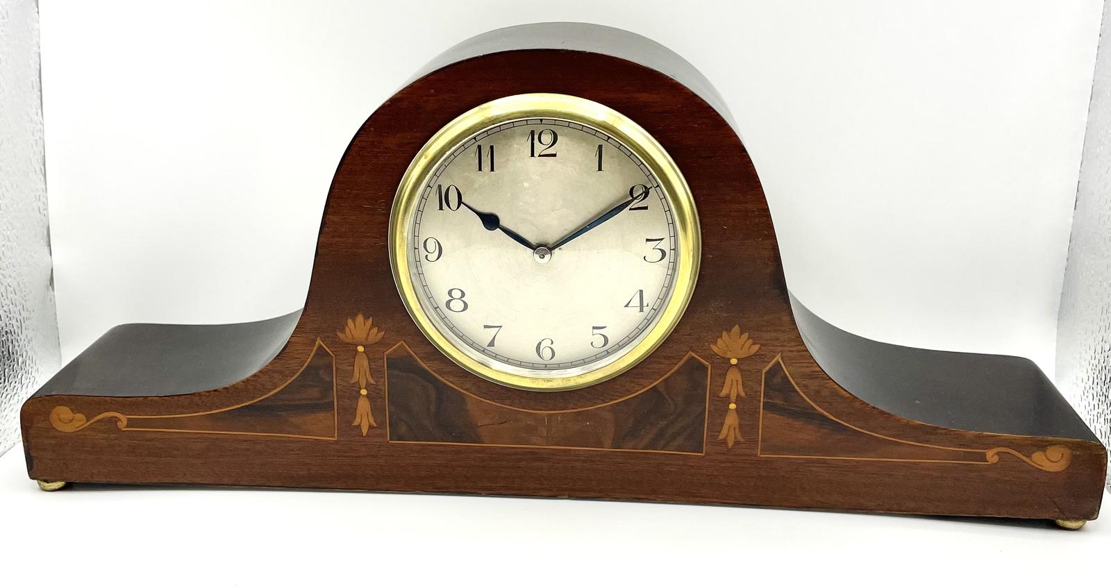An early 20th Century mahogany cased mantel clock in the Sheraton "style" with inlaid detail. English 8 day movement running well and keeping good time.