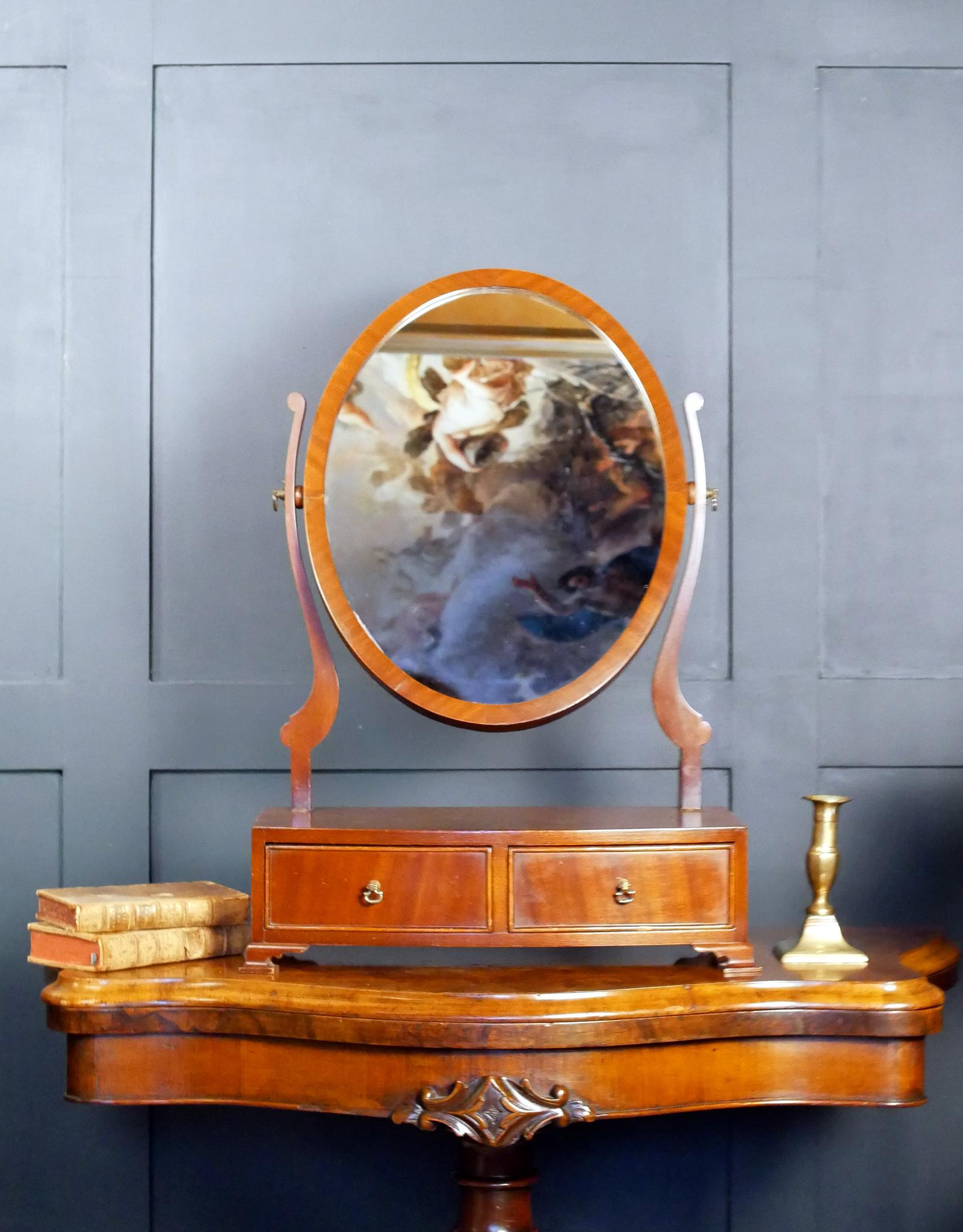 The oval swing mirror is gracefully supported by shaped uprights above a serpentine-fronted base fitted with two cockbeaded drawers. Each drawer retains its original brass swan-neck handles, a pleasing testament to the mirror’s authenticity and careful preservation. The base stands on elegant ogee bracket feet, completing the composition with characteristic Georgian poise.