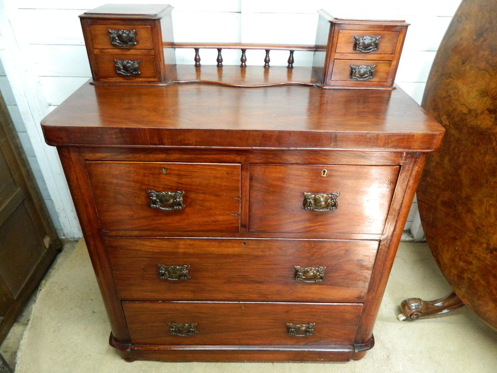 This antique Edwardian mahogany veneer dresser chest of drawers exudes traditional elegance with its 8 spacious drawers and brass handles. Standing at a height of 105cm, width of 46cm, and length of 86cm, it offers ample storage space while maintaining a stylish presence. The rich mahogany finish and Edwardian style make it a timeless piece that complements a range of interior designs, adding a touch of sophistication to any room. Perfect for those seeking a classic and high-quality furniture addition to their home.The dresser chest used to be a dressing table with mirror, but over the years the mirror may have broke, or who knows, the story it could tell. In the top there are 4 small drawers for trinkets, jewellery, or other small items, there is a gallery to the top of the chest , then 2 short over 2 long graduating drawers, all pine so very strong, no knots missing, all slide freely, all locks in place, no keys brass handles, There is a nice graining on the chest, with no cup or burns on the top, please see all pictures for condition.