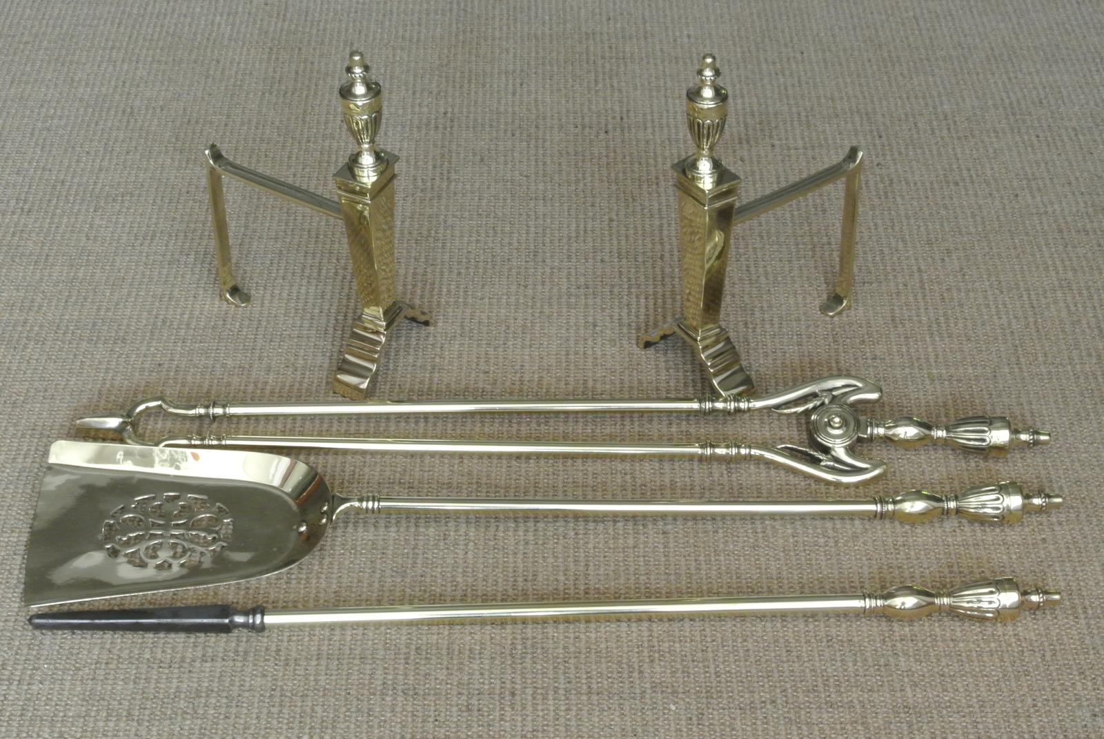 Edwardian Neo Classical Adam Urn Brass Fire Irons & Brass Fire Dogs Companion Set c.1910
