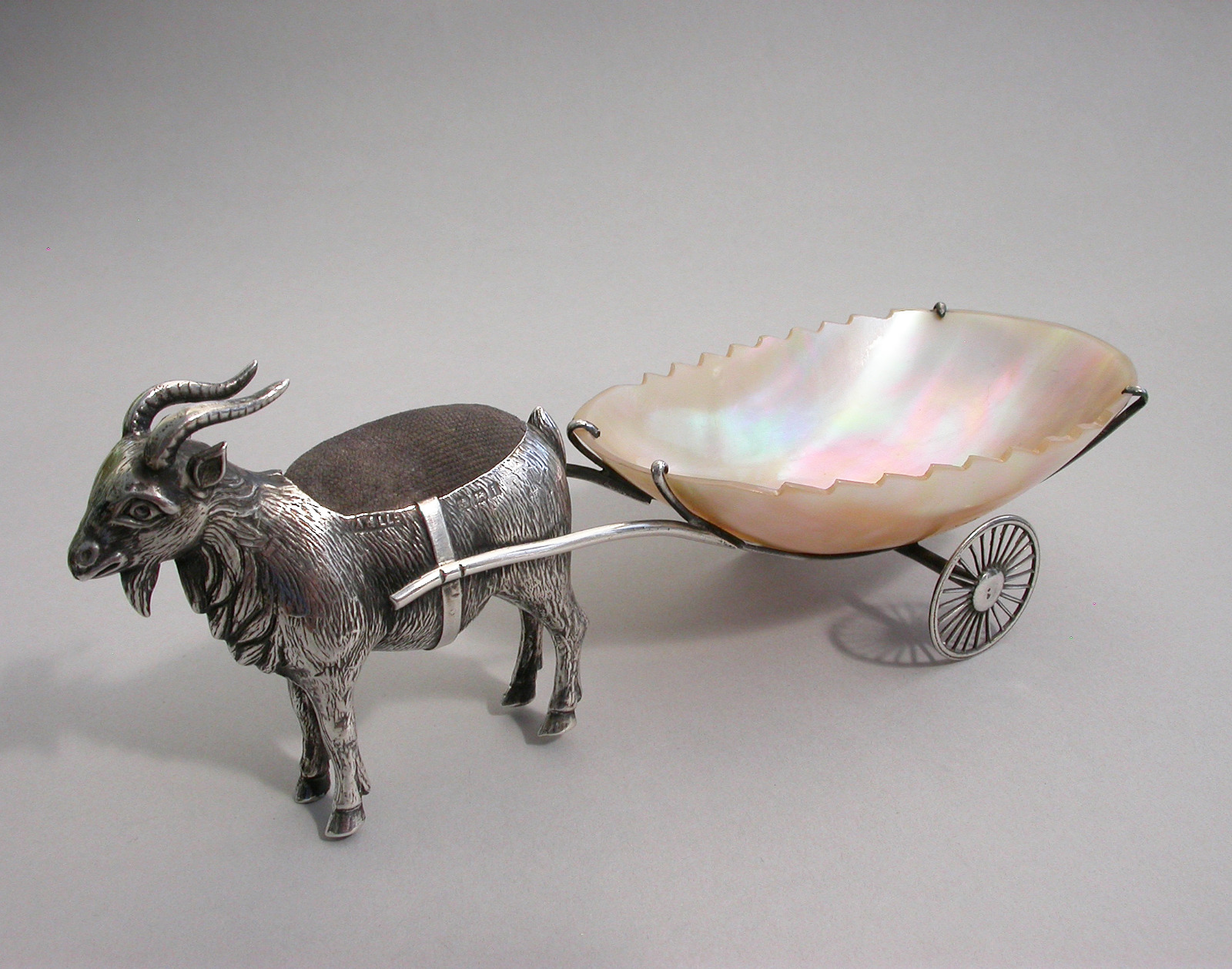 Edwardian Novelty Silver Goat Pulling a Cart Pin Cushion, by Adie & Lovekin, Birmingham, 1908