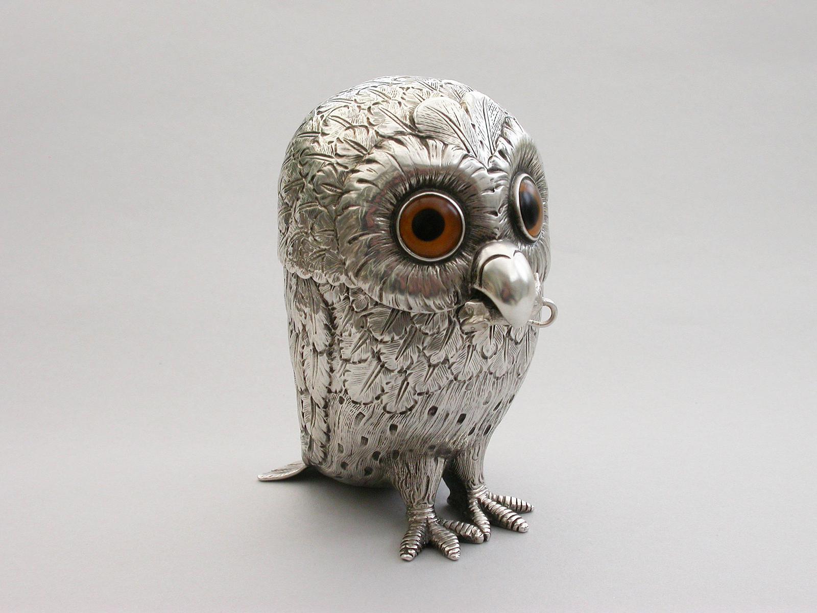Edwardian Novelty Silver Owl Mustard Pot with Mouse Spoon