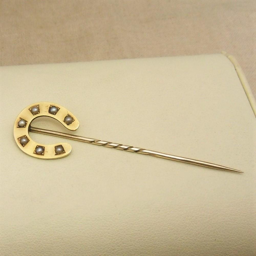 Edwardian Pearl Set Horseshoe Tie Pin Tests 17 & 9ct Gold