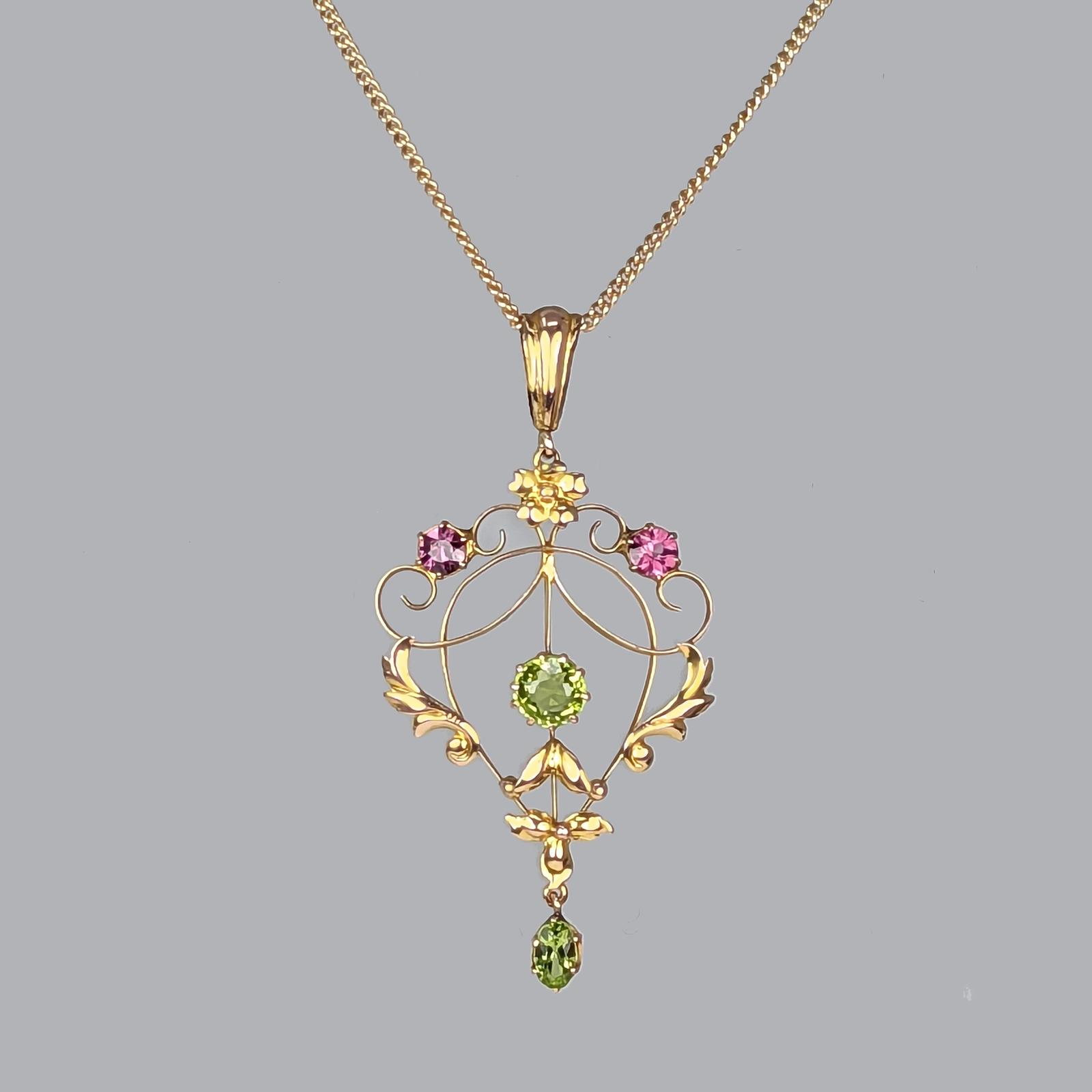Edwardian Peridot and Garnet Pendant with Chain Vintage 9ct Gold Antique Pendant