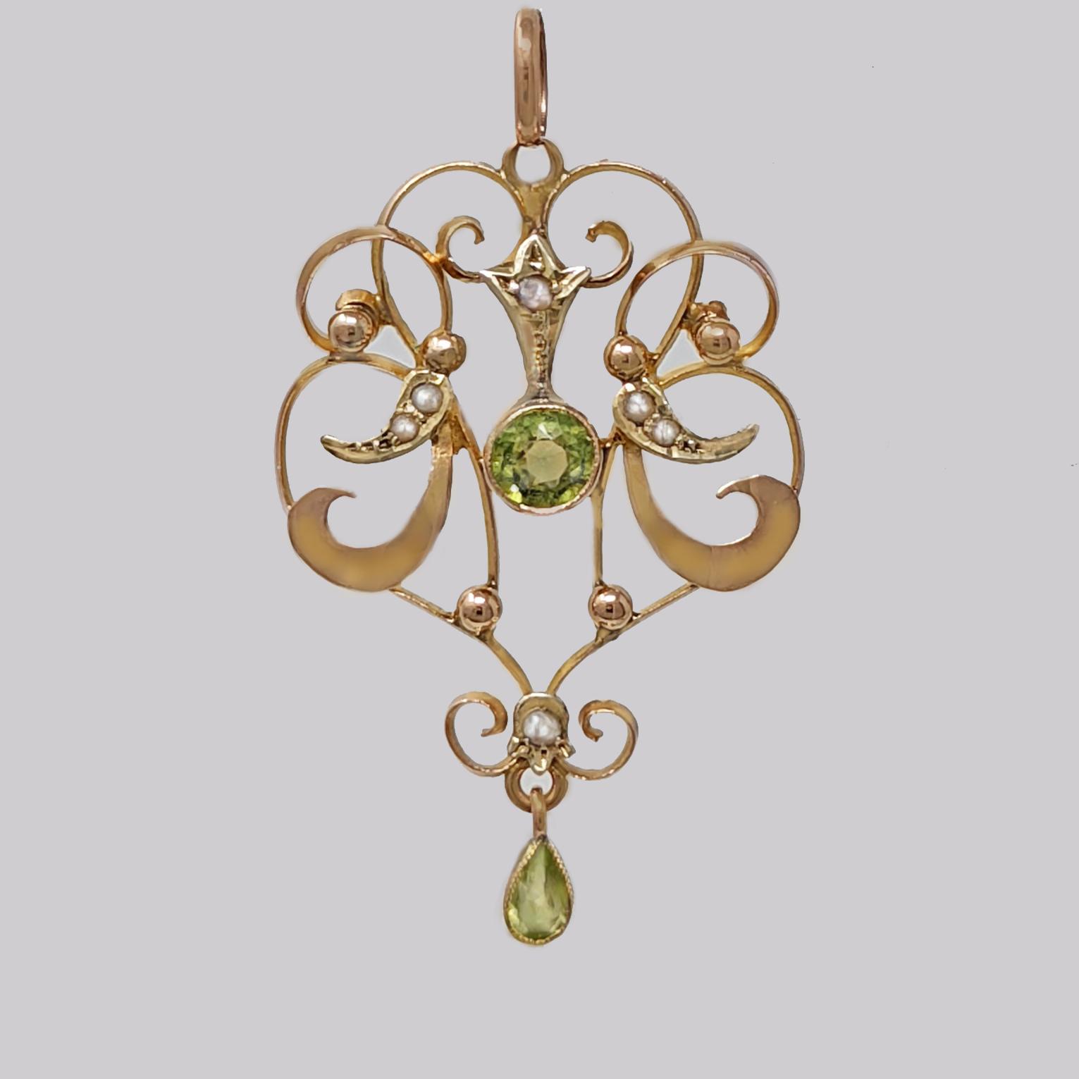 Edwardian Peridot & Pearl Pendant Vintage 9ct Gold Antique Art Nouveau Pendant