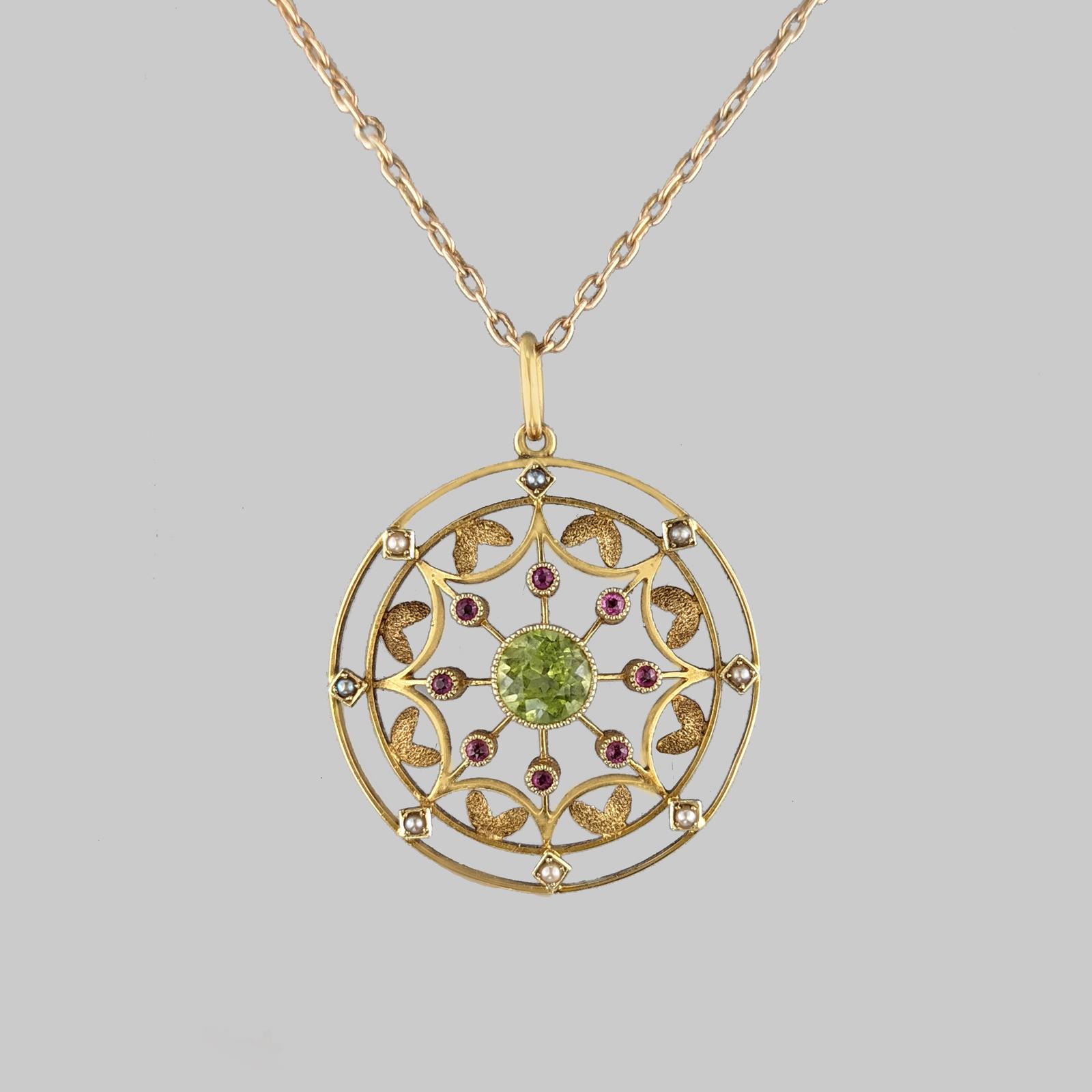 Edwardian Peridot Ruby & Pearl Pendant Vintage 15ct Gold Art Nouveau Necklace (1 of 6)