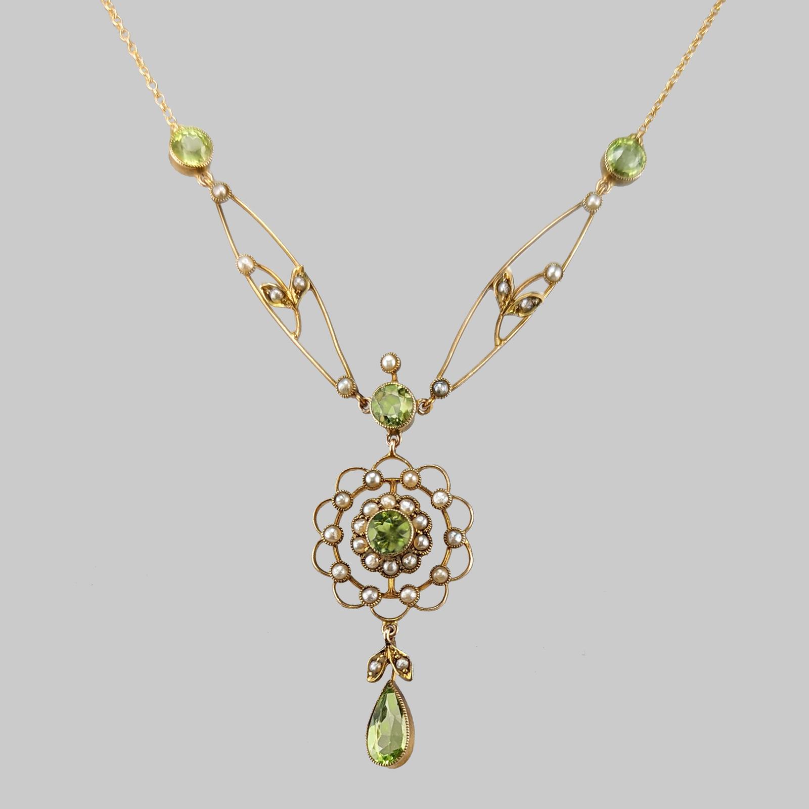Edwardian Peridot & Seed Pearl Antique 9ct Gold Floral Necklace (1 of 8)