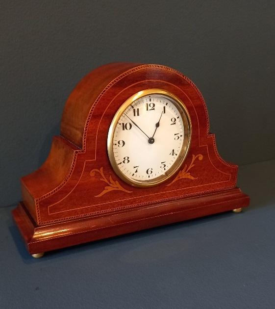 Edwardian Period Fruitwood Inlaid Stepped Top Mantel Clock