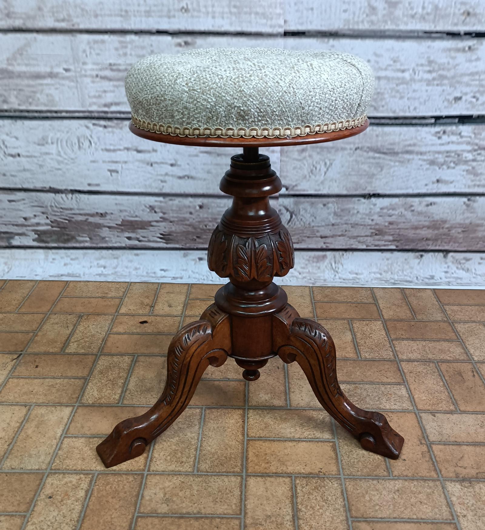 An Edwardian antique revolving and height adjustable piano stool. Beneath the round newly upholstered top is a turned and carved column, this is raised on three carved cabriole legs.